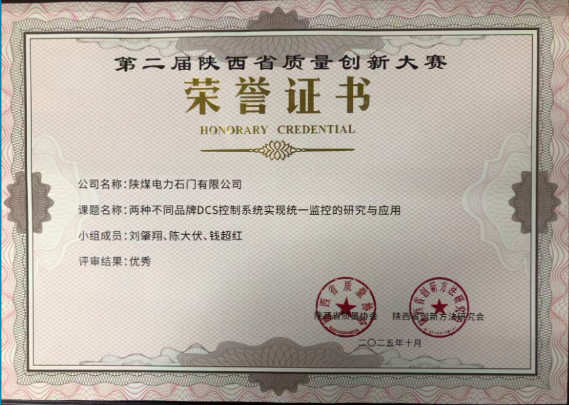 近日,在第二屆陜西省質(zhì)量創(chuàng)新大賽中,陜煤電力石門有限公司申報《兩種不同品牌DCS控制系統(tǒng)實現(xiàn)統(tǒng)一監(jiān)控的研究與應用》榮獲優(yōu)秀獎。《...